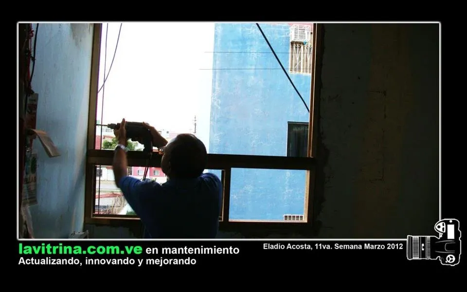 La toma fotográfica muestra instante en la cual se finiquitaba la instalación de la ventana panorámica en lo que fue mi dormitorio oficina, el señor que está quedando sin cabellera es de apellido Cabello, LA VITRINA corresponde a un portal web dedicado al mercadeo electrónico que quedó en proyecto. Causalmente por un canal televisivo sacaron un programa denominado La Vitrina en Construcción, tal como salía cuando se entraba a www.lavitrina.com.ve.