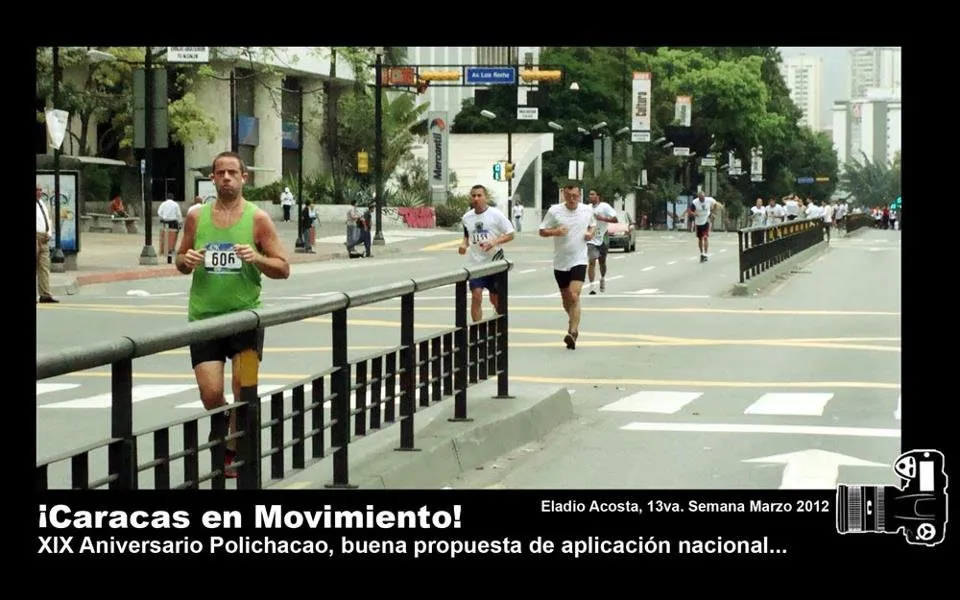 Llego a Caracas y me encuentro con la avenida cerrada, escucho la ambulancia, no veo cola de carros ni gente marchando. Sigo caminando y veo a lo lejos unos policías municipales. Empiezo a ver unas personas trotando, enseguida entiendo que se trataba de un maratón. Es el maratón de la Policía Municipal de Chacao, la cual cumplía diecinueve años de ser fundada.