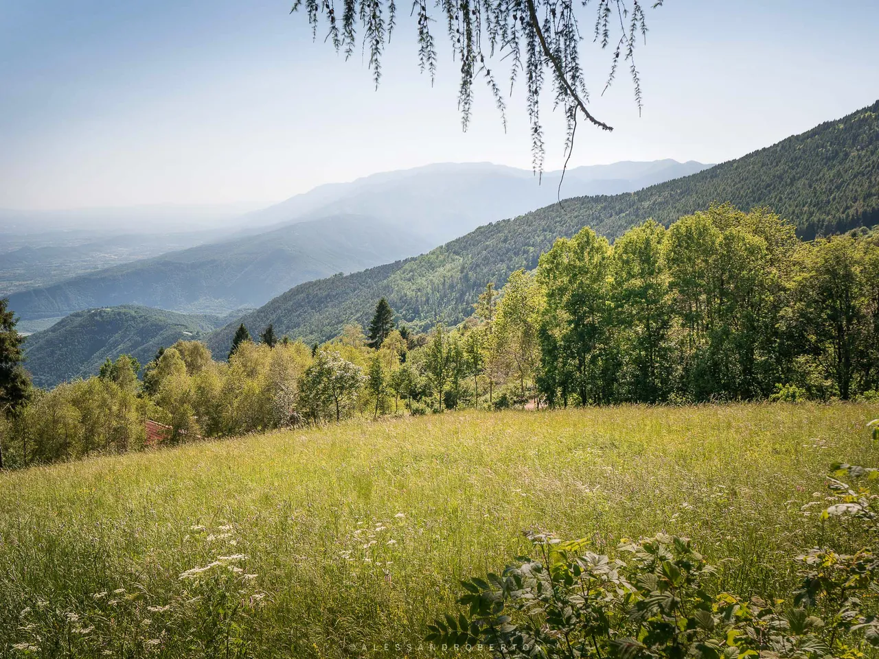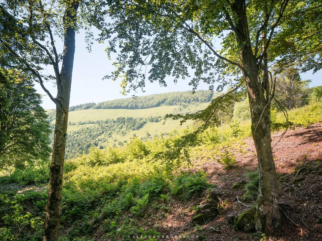Ogni tanto tra le fronde degli alberi si poteve scorgere il panorama circostante, stavo risalendo il Monte Cesen.
