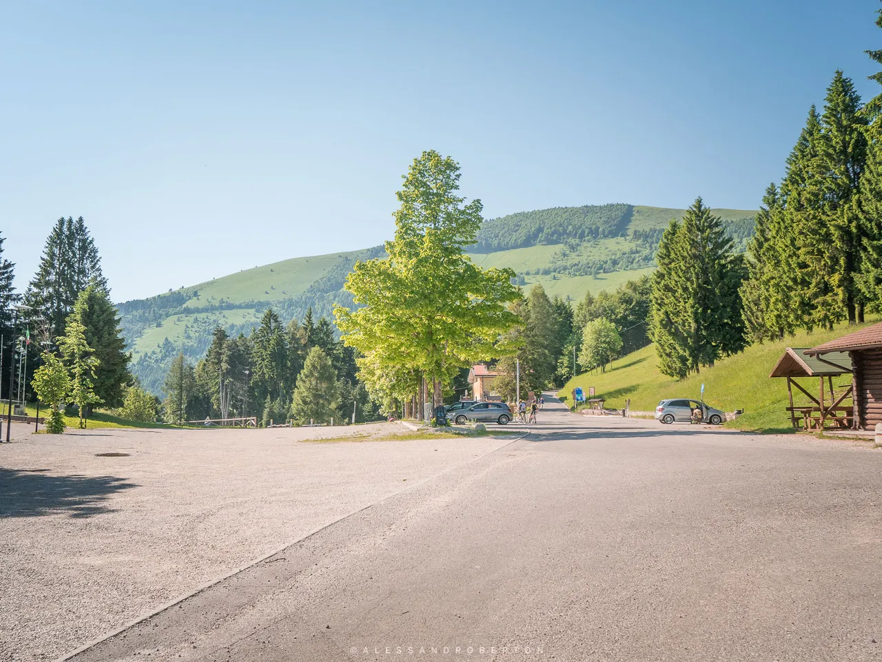 Alla guida della mia auto dopo aver superato una lunga serie di tornanti, sono arrivato in un piazzale molto ampio con un grande parcheggio, alberi piante, un albergo e alcune strutture ricettive.