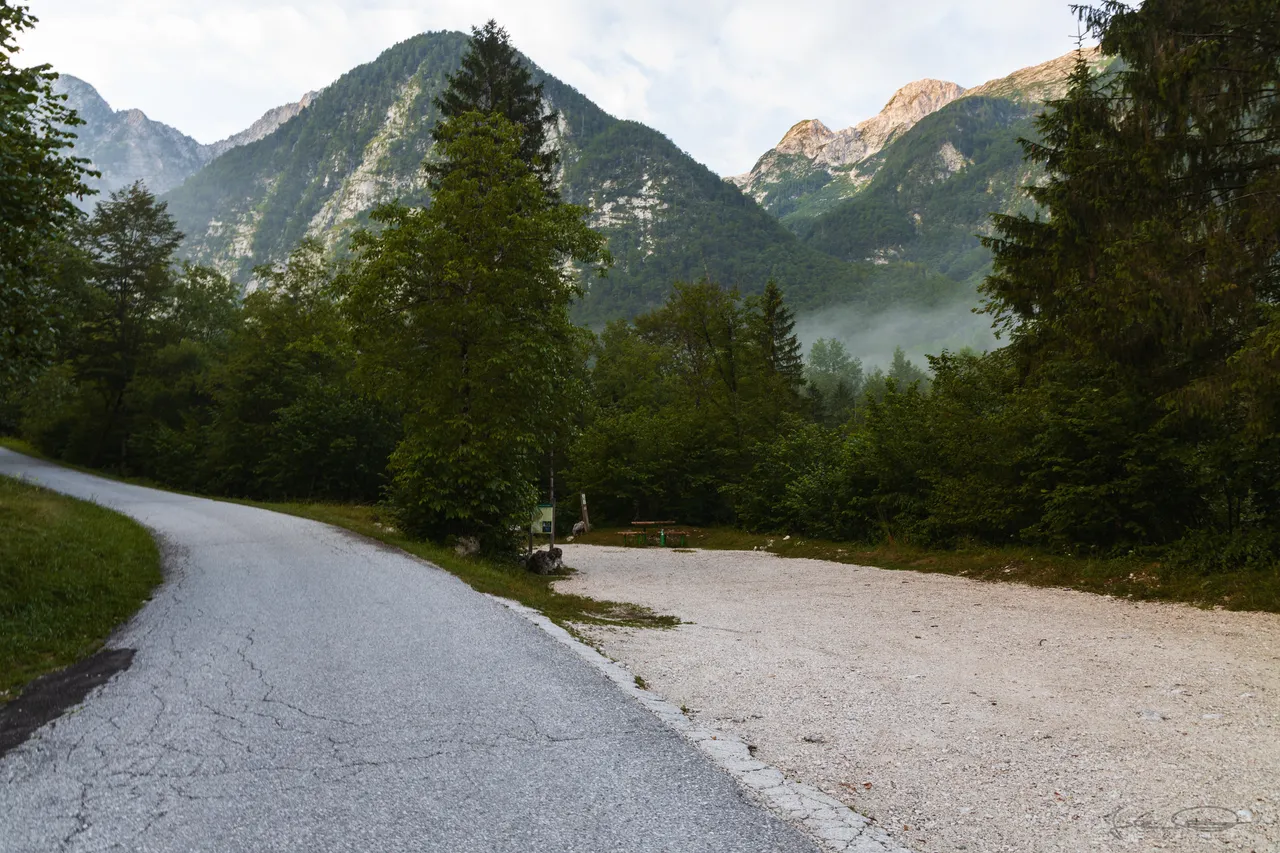In the Soča Valley you drive at the Great Soča Gorge (Velika korita Soče) into the Lepena Valley. After about 3 kilometers on the right is a small gravel parking lot where you can park your car. | Im Soča Tal fährt man an der Großen Soča Schlucht (Velika korita Soče) in das Lepena Tal. Nach ungefähr 3 Kilometern ist rechts ein kleiner Schotterparkplatz, wo man sein Auto abstellen kann. |