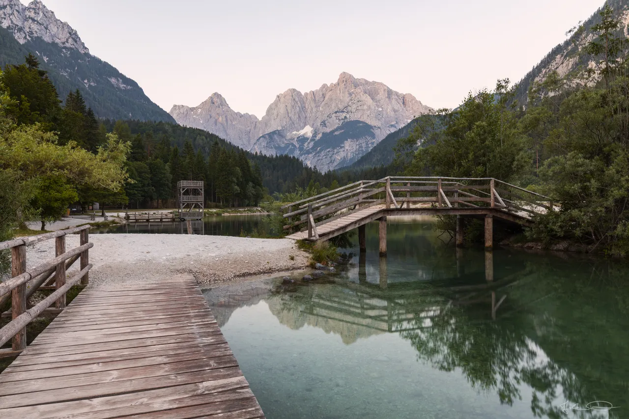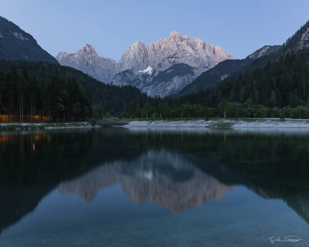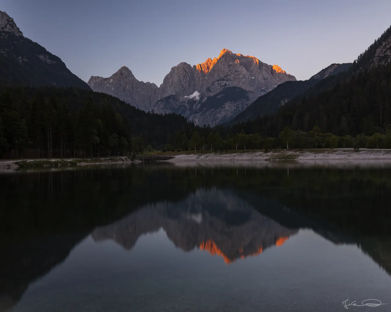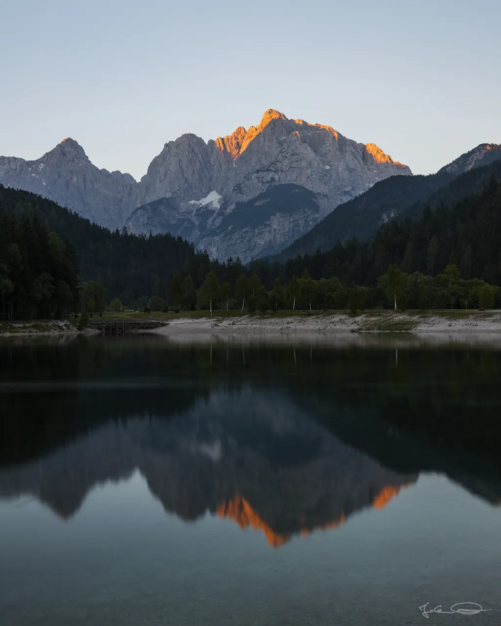 Ich bin also zuerst nach Kranjska Gora gefahren und habe auf den Sonnenaufgang gewartet, der um ca 05:20 Uhr begonnen hat, die Berge zu beleuchten, welche sich im Jasna See spiegelten.