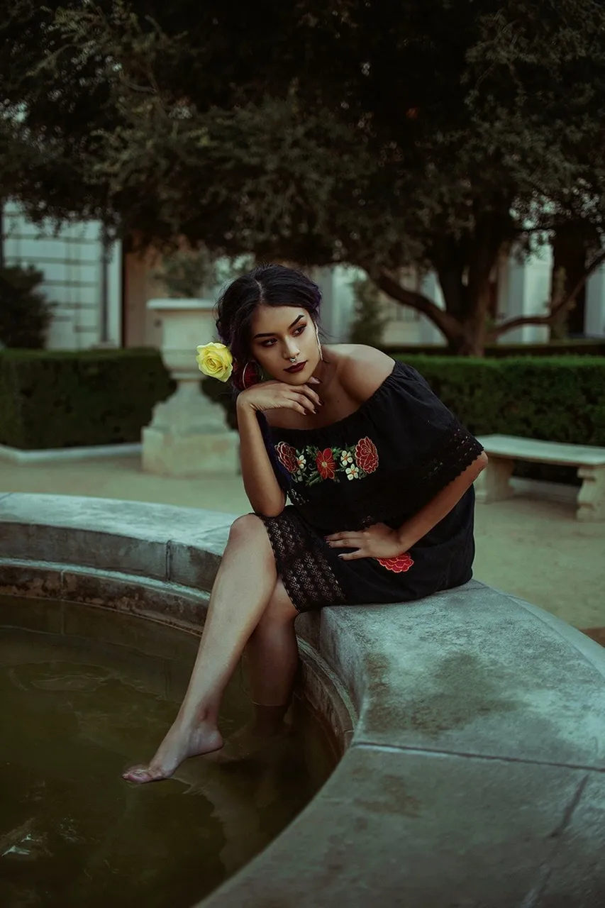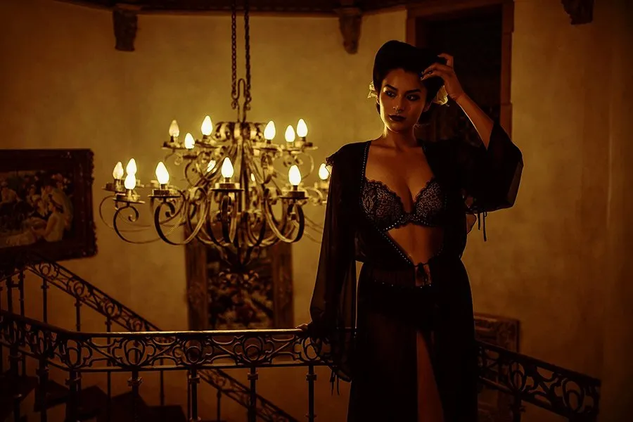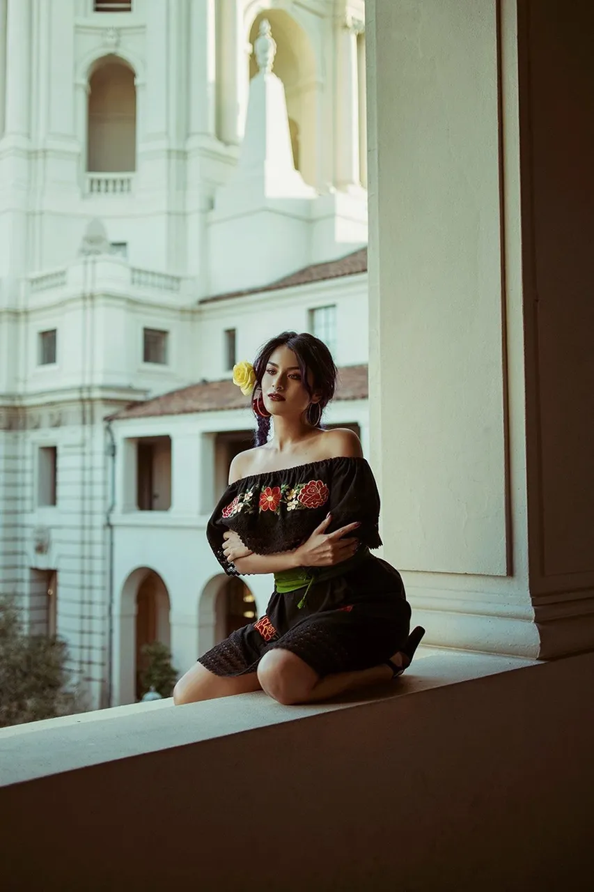 Lupé and I stayed in touch. She’s an artist, illustrator and punk rock enthusiast, so we had a lot in common. Before the trip to LA in August, she contacted me about booking a private session. She placed her deposit and she arrived the day of at the massive vintage estate outside of Los Angeles. She brought two incredible outfits. One representing her Mexican heritage, and a second, sexy black femme fatale lingerie look. The space was perfect and we were able to shoot Pasadena City Hall just as the sun was going down. The second look was throughout the halls of the mansion at night.