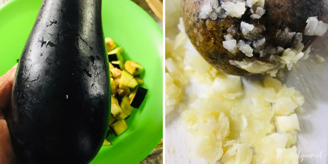 Corté las berenjenas en cuadraditos, igual la cebolla y el ajo los machaqué con una piedra. Reservé