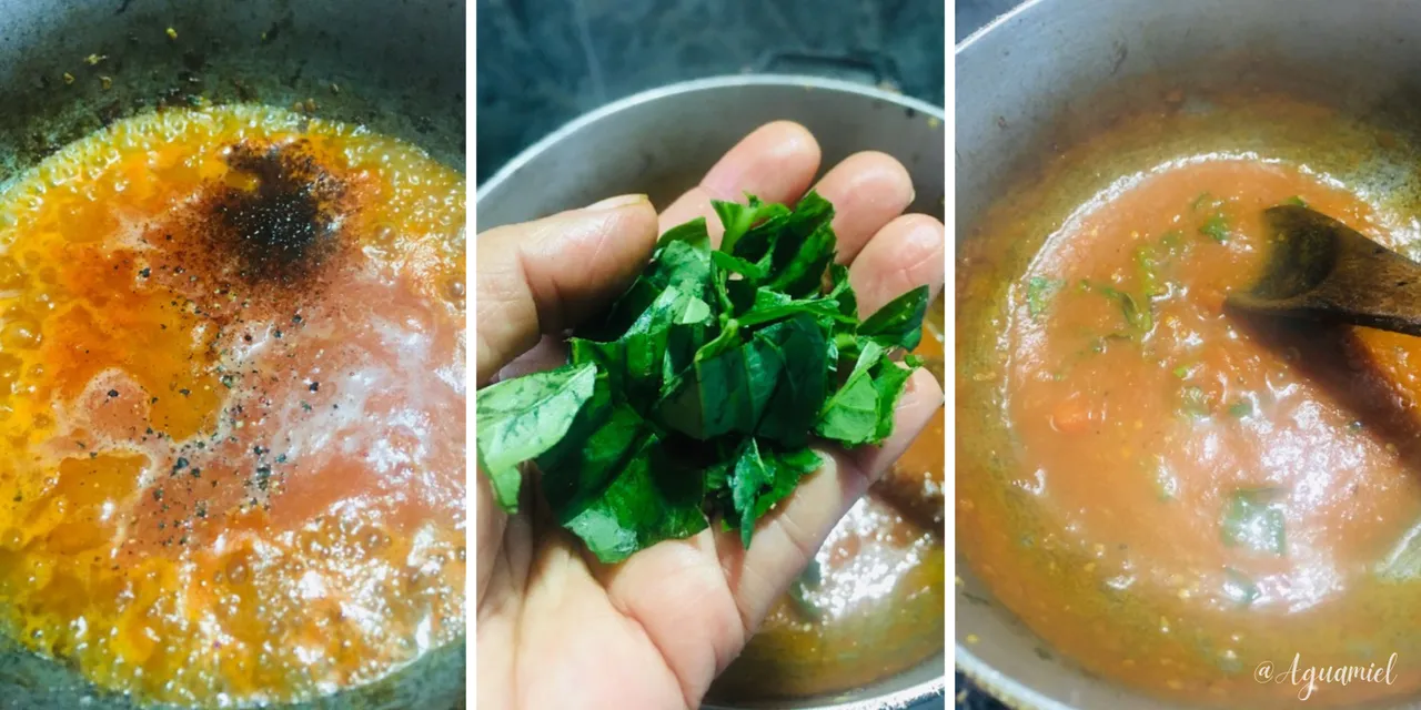 Caliento el caldero para sofreír la salsa que cubrirá las albóndigas, salpimento, añado la paprika, espero que espese y con mis manos corto las hojas de albahaca agregándolas.