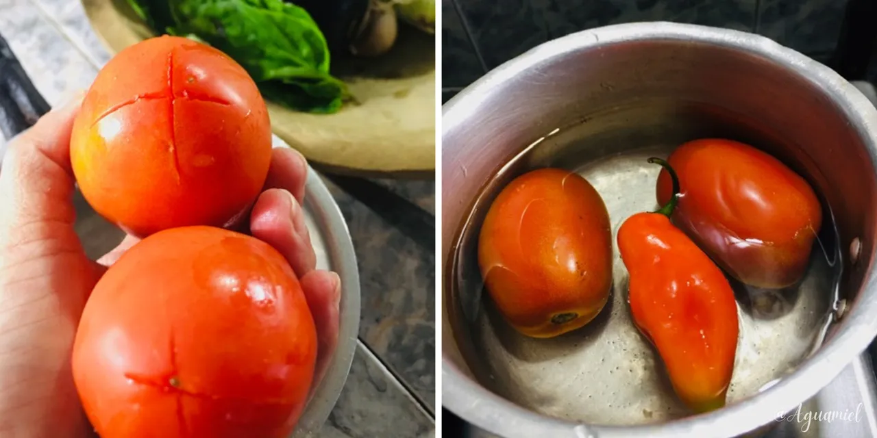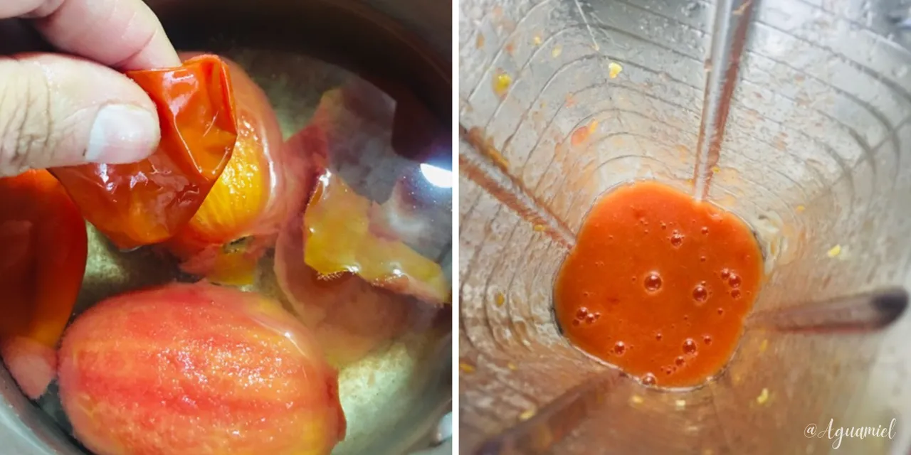 Retiro la piel de los tomates, los llevo a la licuadora con el ají, licúo