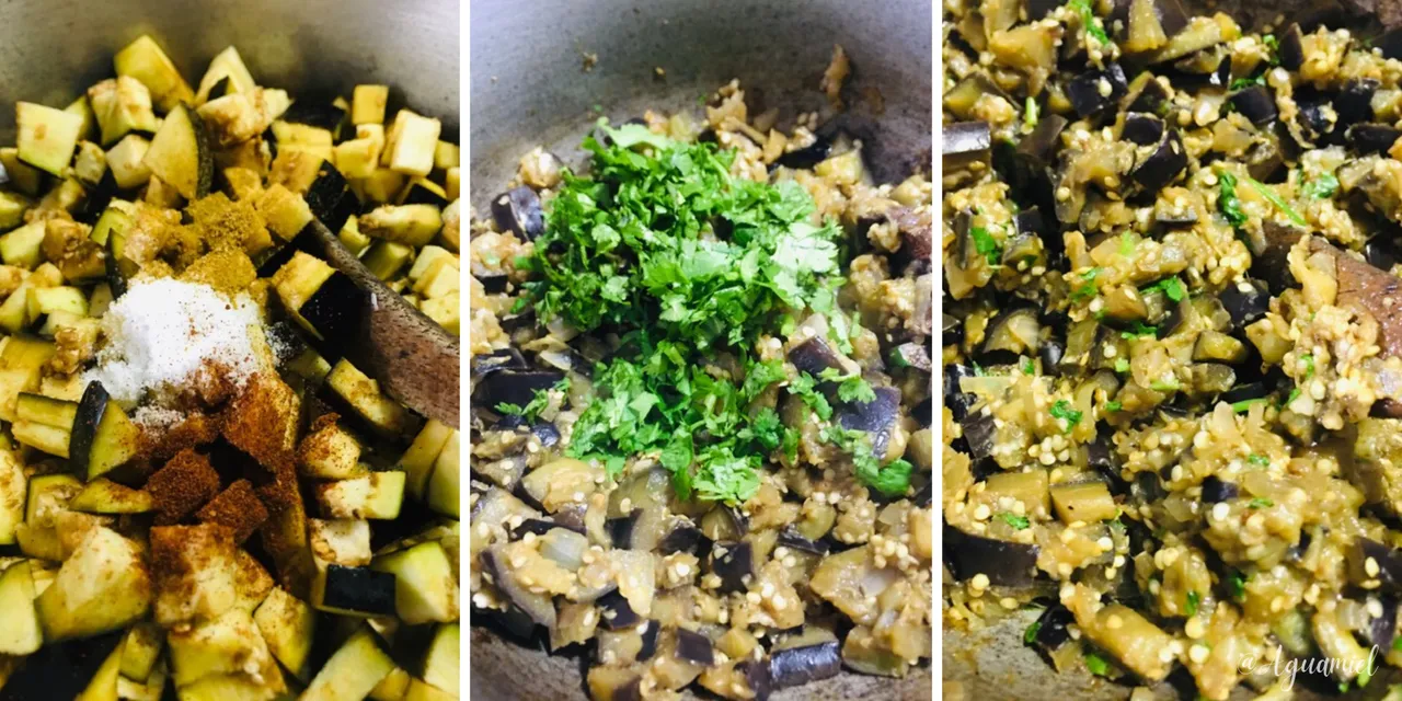 Agrego las especias, corto el cilantro finamente lo agrego a las berenjenas, bajo el fuego y remuevo integrando hasta que estén bien blanditas. Apago y las dejo enfriar