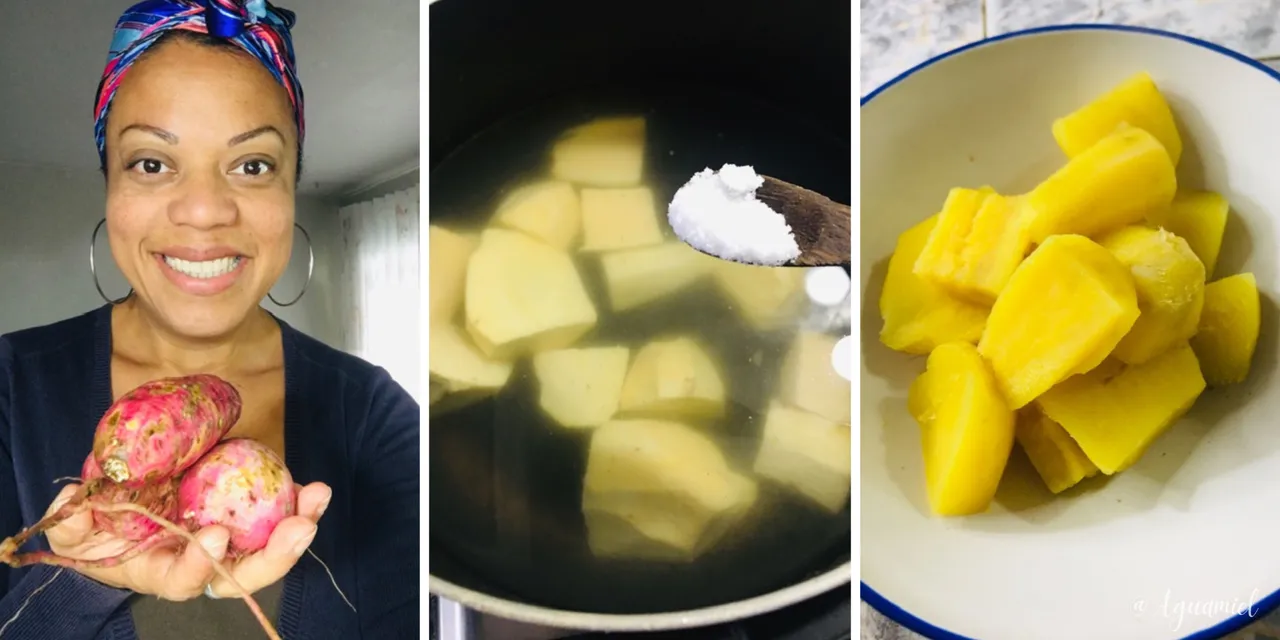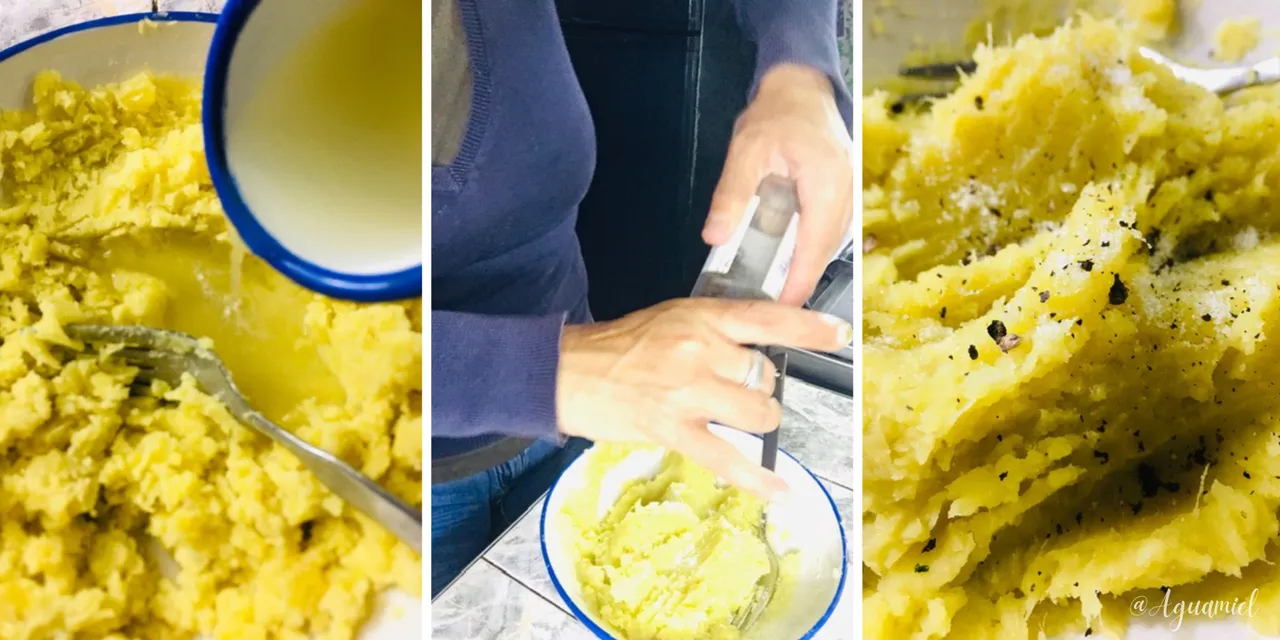 Cuelo las batatas reservando un poco de agua de la cocción con un tenedor las hago puré, agregando poco a poco el agua para hacerlo más suave, rectifico la sal y coloco pimienta. Reservo