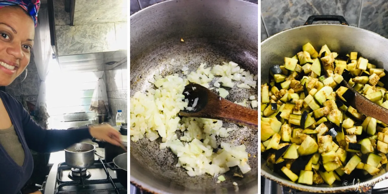 En un caldero coloco un poco de aceite de olivo para sofreír la cebolla y el ajo, cuando desprenda sus olores agrego las berenjenas.