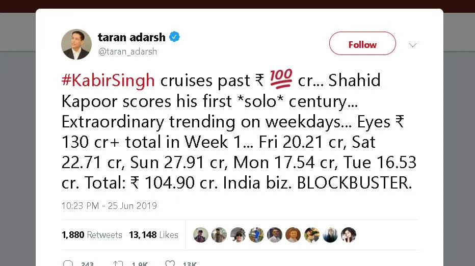 5 din me hi bande ne iss baar 100 crore kama liya bhai jab ki abhi holiday bhi nahi chal raha hai aur world cup ka bhi samay chal raha hai. Fir bhi iss ki film achha kama gayi hai maine to trailer dekh kar hi kah diya tha ki ye film bhai gazab kamayi karne waali hai. Dekho ye film na arjun reddy ki remake hai aur wo bahut achhi chali thi bahut naam suna tha main uss film ka bas yahi wajah hai ki uski wajah ye film bhi mast kama gayi aur film ko usi director ne banaya hai jiss ne arjun reddy banayi thi.
