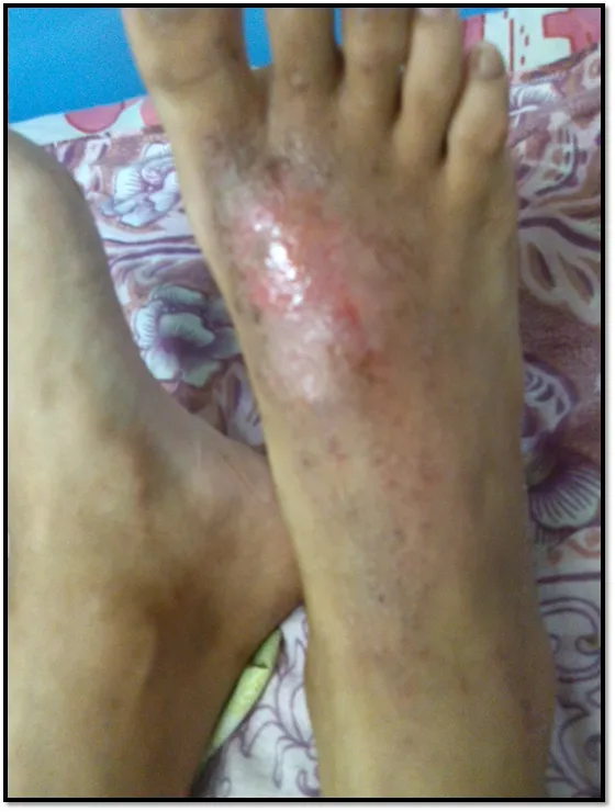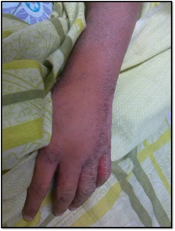 Patients in stable clinical conditions, febrile to the touch hydrated eupneica, skin and mucous membrane normo colors, tolerating oxygen environment and decubitus. Pupils isocoric normoreactive to light, ORL without alterations, non painful mobile neck without adenopathies. Confluent lesions in the form of an itchy scaly plaque with signs of phlogosis, without secretion. Cardiopulmonary stable normoexpansible thorax, apex in 5th intercostal space clavicular midline. Rhythmic heart sounds without murmur. Audible respiratory noises in both hemi thorax. Depreciable soft abdomen not painful without visceromegaly. Symmetrical extremities is evident in upper extremities pruriginous lesions in the arm and forearm and at hand level papular lesions with signs of phlogosis and scarce non-foul serous secretion. In lower limbs, lesions with loss of continuity are evidenced, involving pruritic and painful epidermis. Neurological vigil, consciously oriented in time, space and person without cranial peers without meningeal signs.