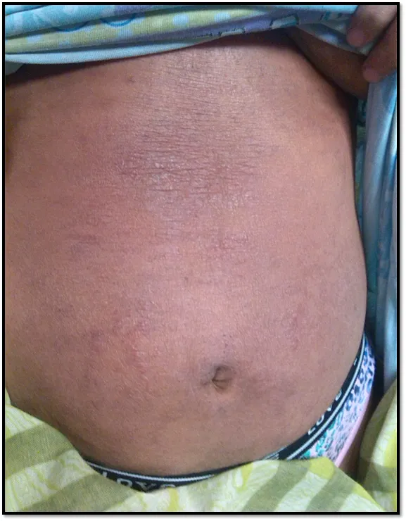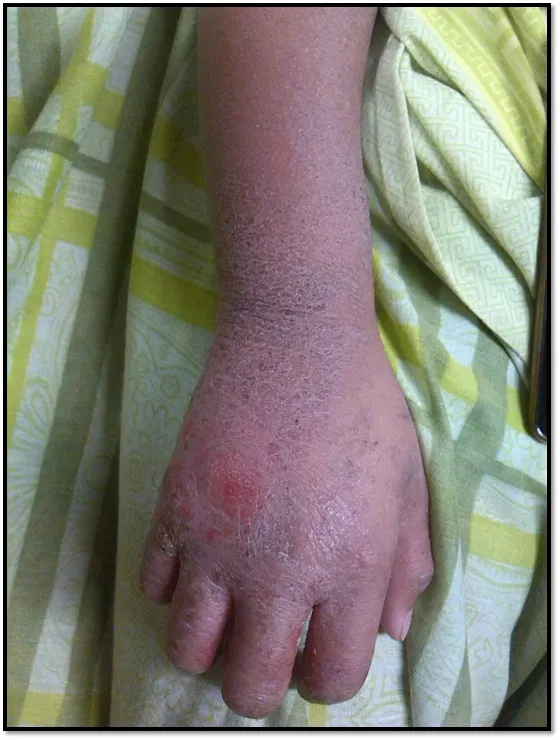 Female patient of 17 years of age without pathological antecedents of importance who refers to the onset of current disease approximately 2 weeks ago characterized by pruritic lesions of papules type of predominance in upper and lower limbs, which later with the days become confluent lesions in the form of scaly plaque with signs of phlogosis, (edema, flushing and heat) reason for which is taken to the emergency service of his locality.