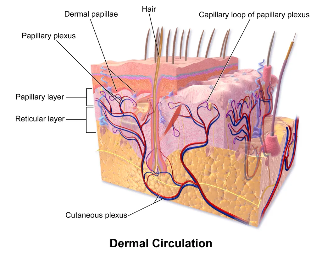 Illustration of dermal circulation and layers. Licensed CC BY-SA 3.0. Author BruceBlaus
