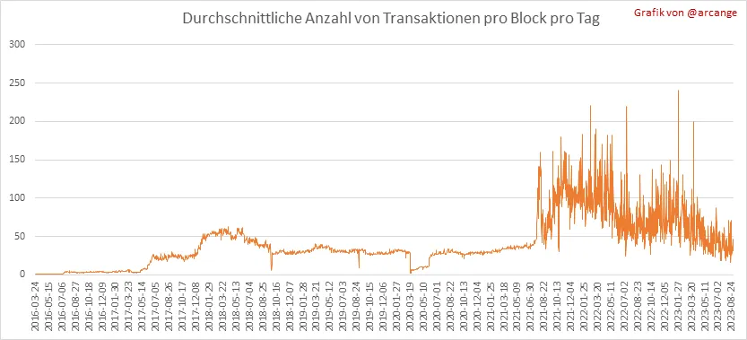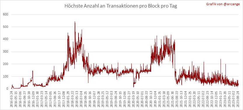 Diese Grafiken zeigen die Anzahl der Transaktionen pro Tag, die höchste Anzahl an Transaktionen pro Block, die durchschnittliche Anzahl an Transaktionen pro Block und die Anzahl der Transaktionen pro Block in den letzten 48 Stunden. Hier bekommt man eine Vorstellung von der gesamten Aktivität auf der Blockchain.