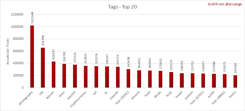 Diese Grafiken zeigen, welche Haupt-Tags für die Veröffentlichung von Posts über die gesamte Blockchain-Lebensdauer und am letzten Tag am häufigsten verwendet wurden.