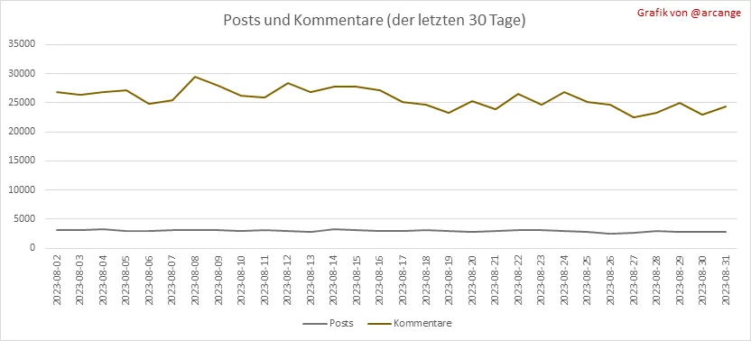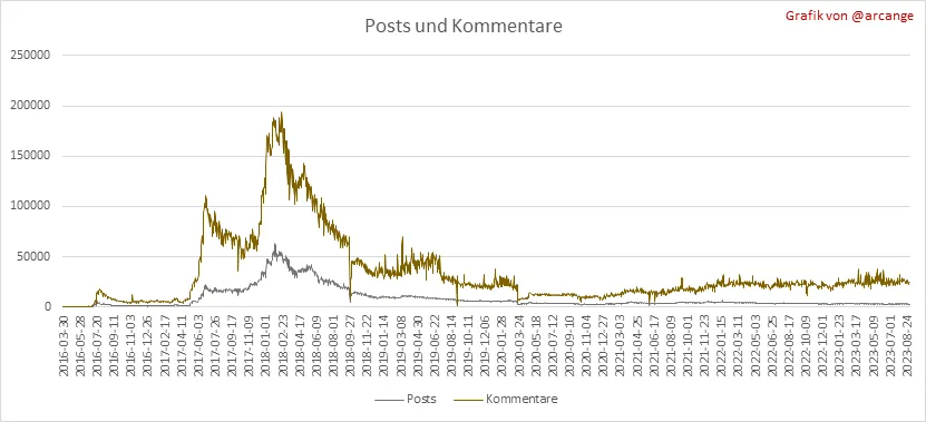 Diese Grafiken zeigen die Entwicklung von Posts und Kommentaren über die gesamte Blockchain-Lebensdauer und der letzten 30 Tage.