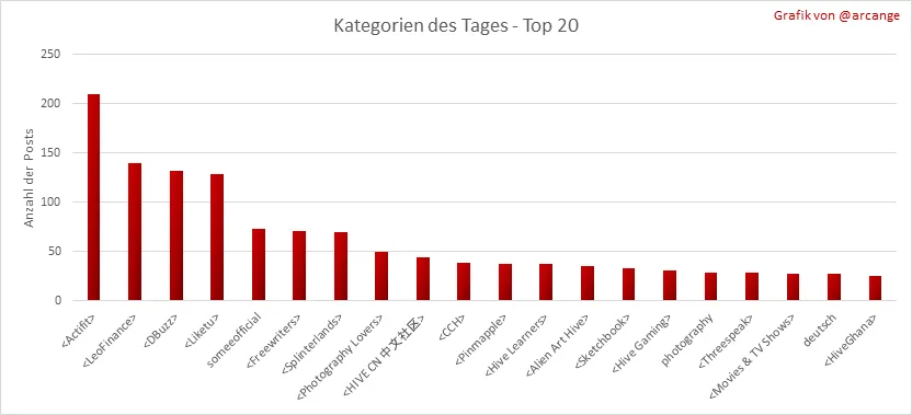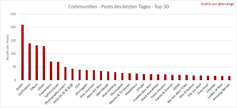 Diese Grafiken zeigen die aktivsten Communitys nach Anzahl der Beiträge (Über die gesamte Blockchain-Lebensdauer und am letzten Tag).