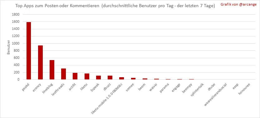 Diese Grafik zeigt, welche Apps am häufigsten zum Veröffentlichen von Posts und Kommentaren verwendet werden. Man beachte dabei, dass ein und derselbe Benutzer mehrere verschiedene Apps verwenden kann.