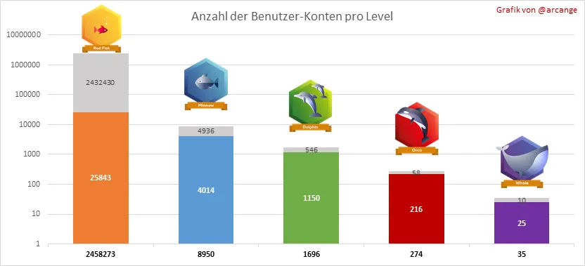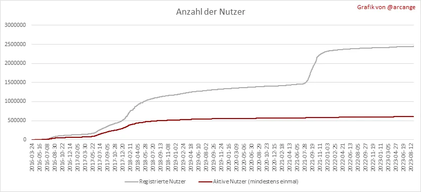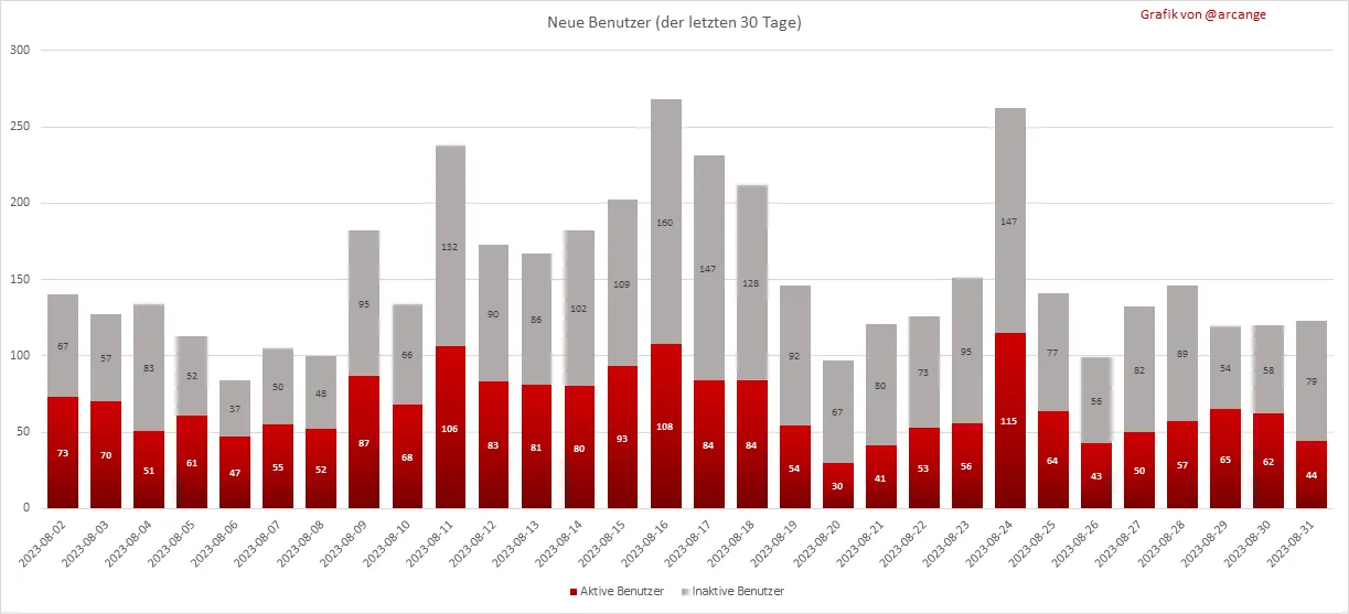 Das letzte Diagramm ist eine monatliche Zusammenfassung der aktiven Benutzer. Vorsicht beim interpretieren vom Wert der letzten Spalte, denn er kann viel niedriger sein, wenn das Monatsende noch nicht erreicht ist.