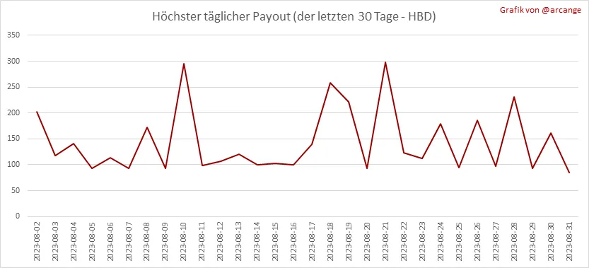 Diese Grafik zeigt den jeweils höchsten Payout, der in den letzten 30 Tagen für einen Beitrag (oder Kommentar) gezahlt wurde.