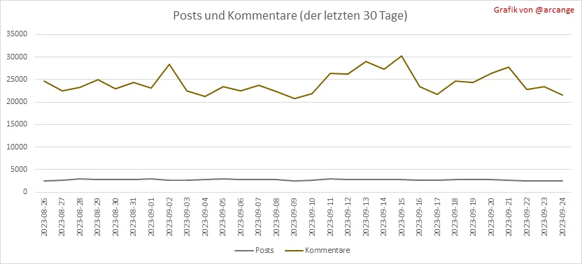 Diese Grafiken zeigen die Entwicklung von Posts und Kommentaren über die gesamte Blockchain-Lebensdauer und der letzten 30 Tage.