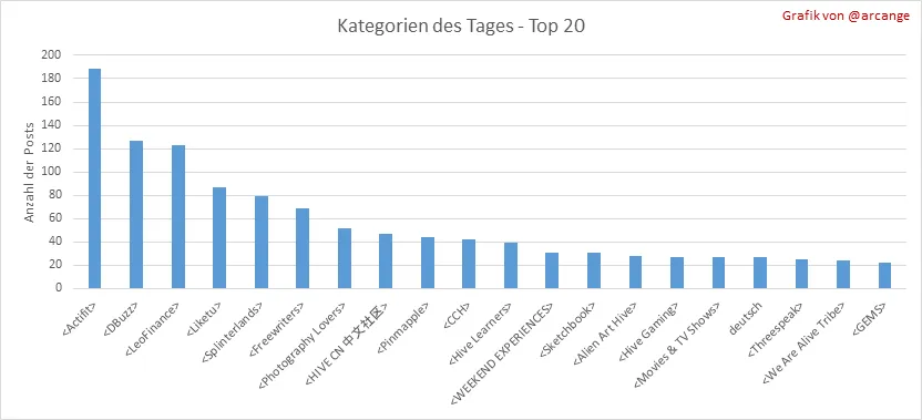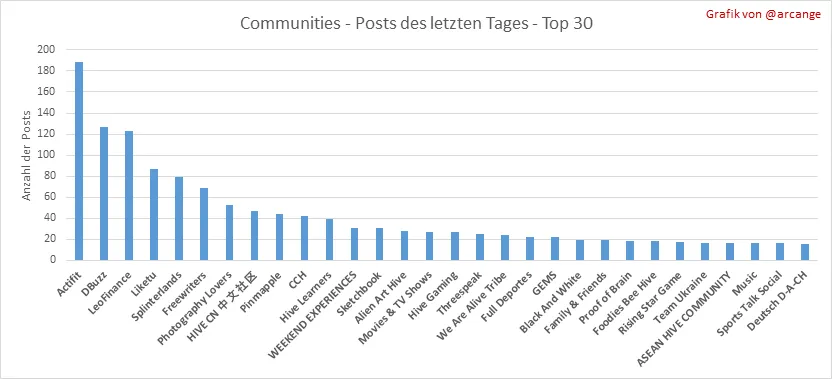 Diese Grafiken zeigen die aktivsten Communitys nach Anzahl der Beiträge (Über die gesamte Blockchain-Lebensdauer und am letzten Tag).