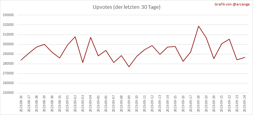 Diese Grafiken zeigen die Entwicklung der Kuration (Upvotes) über die gesamte Blockchain-Lebensdauer und der letzten 30 Tage.