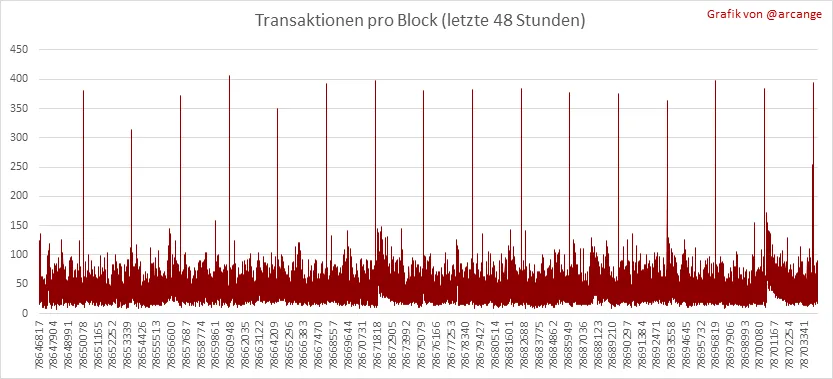 Diese Grafiken zeigen die Anzahl der Transaktionen pro Tag, die höchste Anzahl an Transaktionen pro Block, die durchschnittliche Anzahl an Transaktionen pro Block und die Anzahl der Transaktionen pro Block in den letzten 48 Stunden. Hier bekommt man eine Vorstellung von der gesamten Aktivität auf der Blockchain.