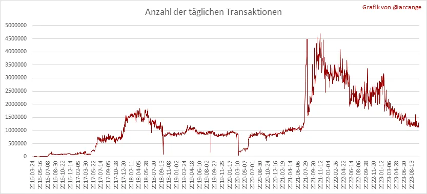 Diese Tabelle zeigt die Anzahl der neu registrierten Benutzer auf der Blockchain und wie viele von ihnen aktiv sind. Das Diagramm ist dynamisch! Ein Benutzer kann sich an einem Tag registrieren und erst ein paar Tage später aktiv werden. Daher kann sich die Anzahl der aktiven Benutzer an einem bestimmten Datum von Tag zu Tag ändern.