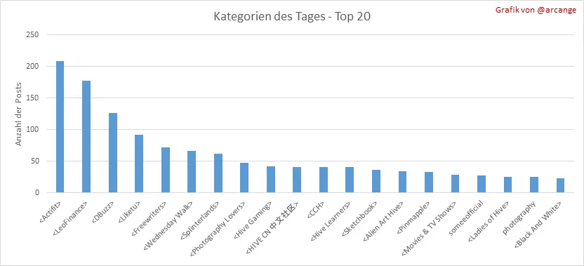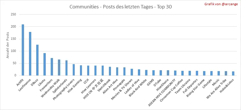 Diese Grafiken zeigen die aktivsten Communitys nach Anzahl der Beiträge (Über die gesamte Blockchain-Lebensdauer und am letzten Tag).