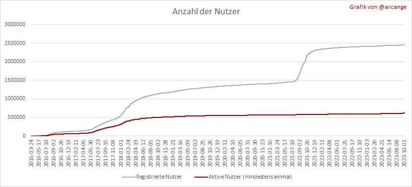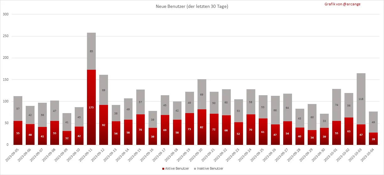 Das letzte Diagramm ist eine monatliche Zusammenfassung der aktiven Benutzer. Vorsicht beim interpretieren vom Wert der letzten Spalte, denn er kann viel niedriger sein, wenn das Monatsende noch nicht erreicht ist.