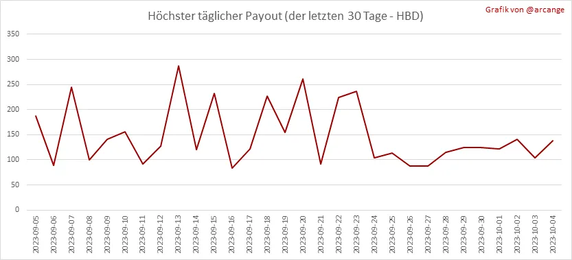 Diese Grafik zeigt den jeweils höchsten Payout, der in den letzten 30 Tagen für einen Beitrag (oder Kommentar) gezahlt wurde.