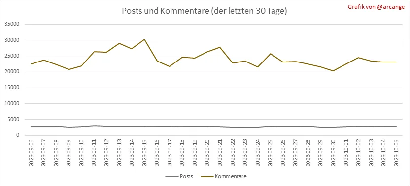Diese Grafiken zeigen die Entwicklung von Posts und Kommentaren über die gesamte Blockchain-Lebensdauer und der letzten 30 Tage.