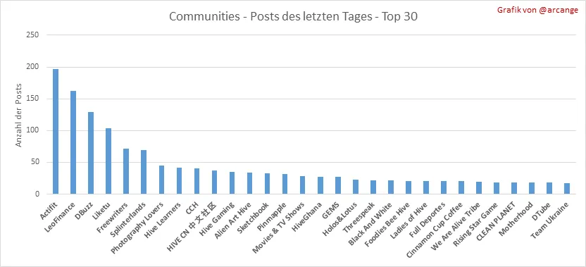 Diese Grafiken zeigen die aktivsten Communitys nach Anzahl der Beiträge (Über die gesamte Blockchain-Lebensdauer und am letzten Tag).