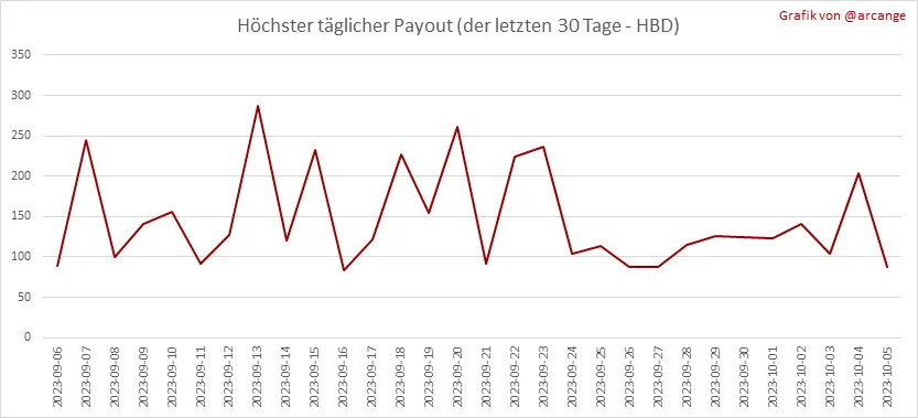 Diese Grafik zeigt den jeweils höchsten Payout, der in den letzten 30 Tagen für einen Beitrag (oder Kommentar) gezahlt wurde.