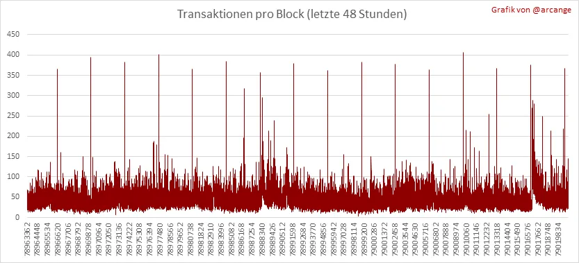 Diese Grafiken zeigen die Anzahl der Transaktionen pro Tag, die höchste Anzahl an Transaktionen pro Block, die durchschnittliche Anzahl an Transaktionen pro Block und die Anzahl der Transaktionen pro Block in den letzten 48 Stunden. Hier bekommt man eine Vorstellung von der gesamten Aktivität auf der Blockchain.
