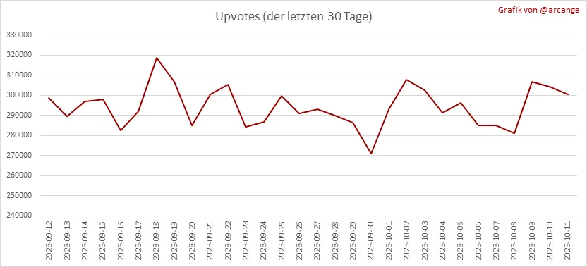 Diese Grafiken zeigen die Entwicklung der Kuration (Upvotes) über die gesamte Blockchain-Lebensdauer und der letzten 30 Tage.