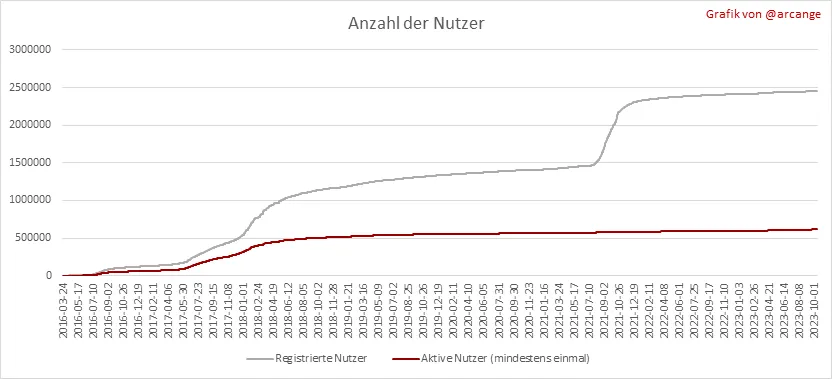 Das letzte Diagramm ist eine monatliche Zusammenfassung der aktiven Benutzer. Vorsicht beim interpretieren vom Wert der letzten Spalte, denn er kann viel niedriger sein, wenn das Monatsende noch nicht erreicht ist.