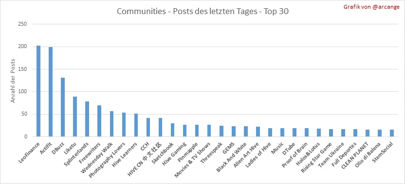 Diese Grafiken zeigen die aktivsten Communitys nach Anzahl der Beiträge (Über die gesamte Blockchain-Lebensdauer und am letzten Tag).