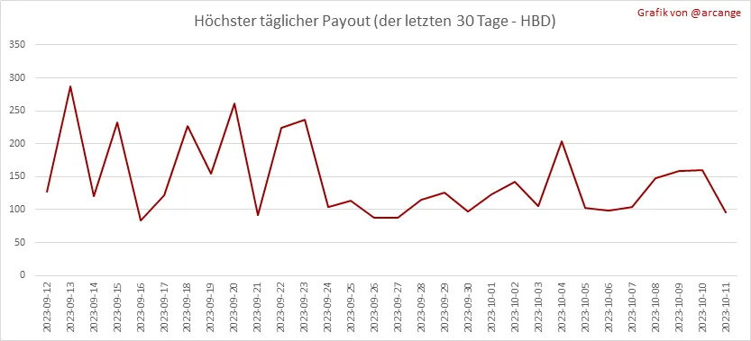 Diese Grafik zeigt den jeweils höchsten Payout, der in den letzten 30 Tagen für einen Beitrag (oder Kommentar) gezahlt wurde.