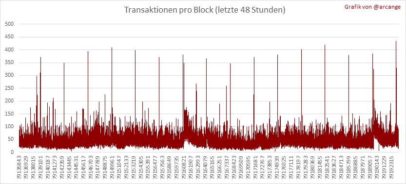 Diese Grafiken zeigen die Anzahl der Transaktionen pro Tag, die höchste Anzahl an Transaktionen pro Block, die durchschnittliche Anzahl an Transaktionen pro Block und die Anzahl der Transaktionen pro Block in den letzten 48 Stunden. Hier bekommt man eine Vorstellung von der gesamten Aktivität auf der Blockchain.