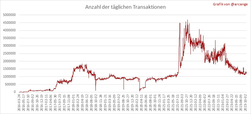 Diese Tabelle zeigt die Anzahl der neu registrierten Benutzer auf der Blockchain und wie viele von ihnen aktiv sind. Das Diagramm ist dynamisch! Ein Benutzer kann sich an einem Tag registrieren und erst ein paar Tage später aktiv werden. Daher kann sich die Anzahl der aktiven Benutzer an einem bestimmten Datum von Tag zu Tag ändern.