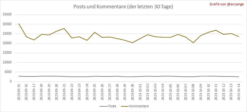 Diese Grafiken zeigen die Entwicklung von Posts und Kommentaren über die gesamte Blockchain-Lebensdauer und der letzten 30 Tage.