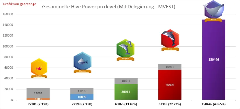 Diese Grafik zeigt die Verteilung der Hive Power pro Kontolevel. Das linke Diagramm zeigt die Verteilung ohne Berücksichtigung von Delegierungen, die von den Konten vorgenommen oder empfangen wurden. Die rechten Diagramme berücksichtigen die Delegierung, fügen die empfangene HP-Delegierung hinzu und subtrahieren die abgegebene HP-Delegierung.