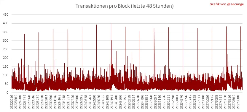 Diese Grafiken zeigen die Anzahl der Transaktionen pro Tag, die höchste Anzahl an Transaktionen pro Block, die durchschnittliche Anzahl an Transaktionen pro Block und die Anzahl der Transaktionen pro Block in den letzten 48 Stunden. Hier bekommt man eine Vorstellung von der gesamten Aktivität auf der Blockchain.