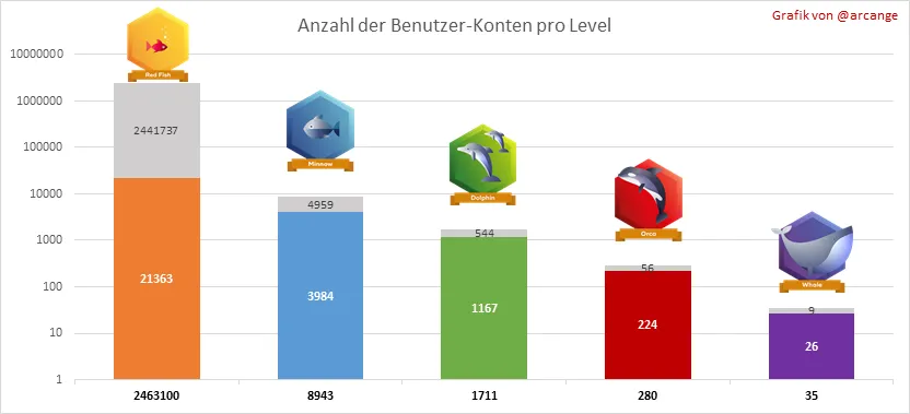 Das letzte Diagramm ist eine monatliche Zusammenfassung der aktiven Benutzer. Vorsicht beim interpretieren vom Wert der letzten Spalte, denn er kann viel niedriger sein, wenn das Monatsende noch nicht erreicht ist.