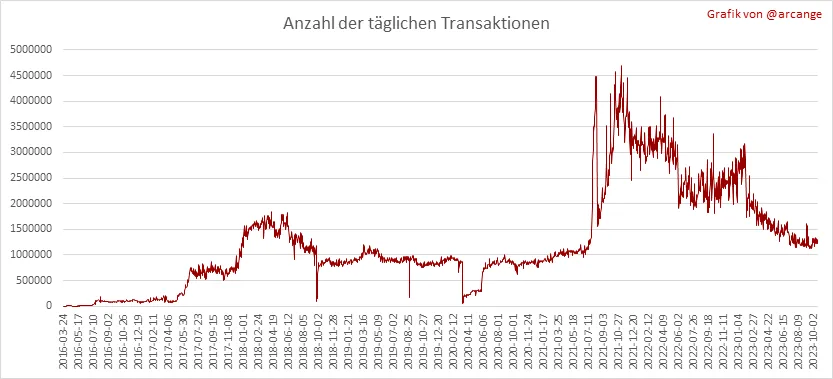 Diese Tabelle zeigt die Anzahl der neu registrierten Benutzer auf der Blockchain und wie viele von ihnen aktiv sind. Das Diagramm ist dynamisch! Ein Benutzer kann sich an einem Tag registrieren und erst ein paar Tage später aktiv werden. Daher kann sich die Anzahl der aktiven Benutzer an einem bestimmten Datum von Tag zu Tag ändern.