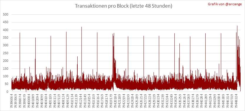 Diese Grafiken zeigen die Anzahl der Transaktionen pro Tag, die höchste Anzahl an Transaktionen pro Block, die durchschnittliche Anzahl an Transaktionen pro Block und die Anzahl der Transaktionen pro Block in den letzten 48 Stunden. Hier bekommt man eine Vorstellung von der gesamten Aktivität auf der Blockchain.