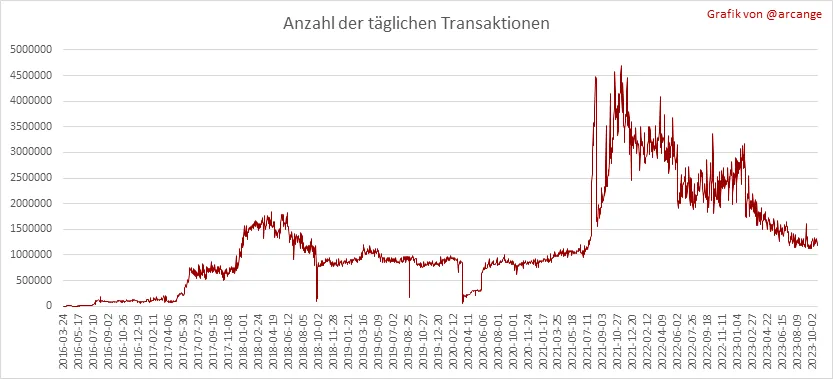 Diese Tabelle zeigt die Anzahl der neu registrierten Benutzer auf der Blockchain und wie viele von ihnen aktiv sind. Das Diagramm ist dynamisch! Ein Benutzer kann sich an einem Tag registrieren und erst ein paar Tage später aktiv werden. Daher kann sich die Anzahl der aktiven Benutzer an einem bestimmten Datum von Tag zu Tag ändern.