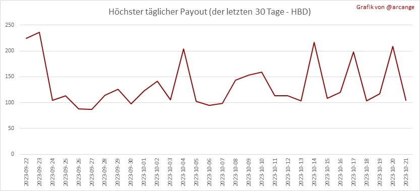 Diese Grafik zeigt den jeweils höchsten Payout, der in den letzten 30 Tagen für einen Beitrag (oder Kommentar) gezahlt wurde.